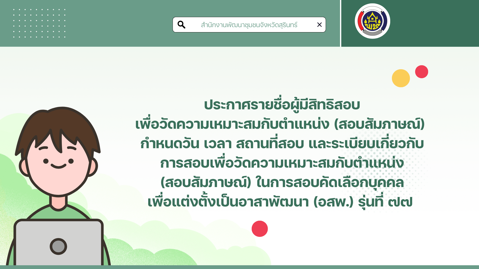 ประกาศรายชื่อผู้มีสิทธิสอบ เพื่อวัดความเหมาะสมกับตำแหน่ง (สอบสัมภาษณ์) กำหนดวัน เวลา สถานที่สอบ และระเบียบเกี่ยวกับการสอบเพื่อวัดความเหมาะสมกับตำแหน่ง (สอบสัมภาษณ์) ในการสอบคัดเลือกบุคคลเพื่อแต่งตั้งเป็นอาสาพัฒนา (อสพ.) รุ่นที่ ๗๗